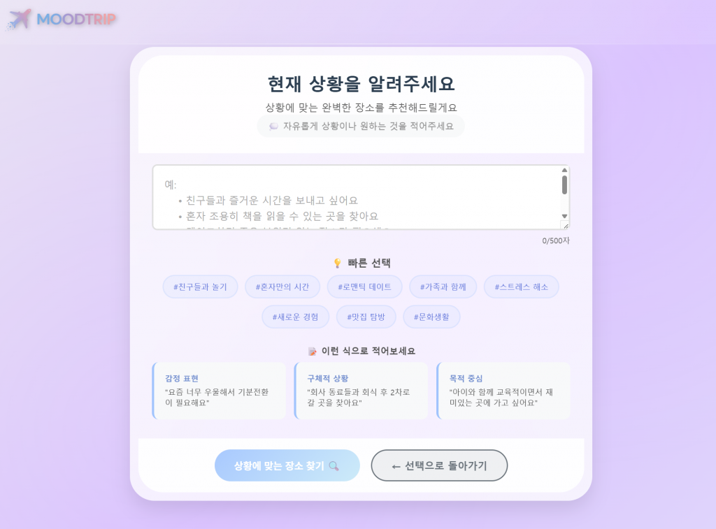 Mood Trip은 “오늘 뭐하지?”, “오늘 어디가지?”와 같은 일상적인 선택의 고민을 해결하기 위해 사용자의 추상적인 감정이나 상황입력을 AI가 구체적인 장소 키워드로 변환하여 검색의 편의성과 정확도를 향상하였으며 네이버 지도 실시간 크롤링을 통해 장소정보를 제공합니다.